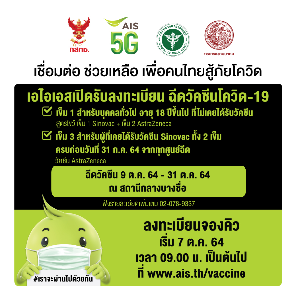 Ais กระทรวงสาธารณส ข ร วมก บ เอไอเอส และ กสทช เป ดให บ คคลท วไปท ม อาย 50 ป ข นไป หร อผ ม โรคประจำต ว 7 กล มโรค ได แก ปอดและระบบทางเด นหายใจ ห วใจ ไต หลอดเล อดสมอง มะเร ง เบาหวาน และโรคอ วน ลงทะเบ ยนเข าร บการฉ ดว คซ นโคว ด 19 เข มท 1