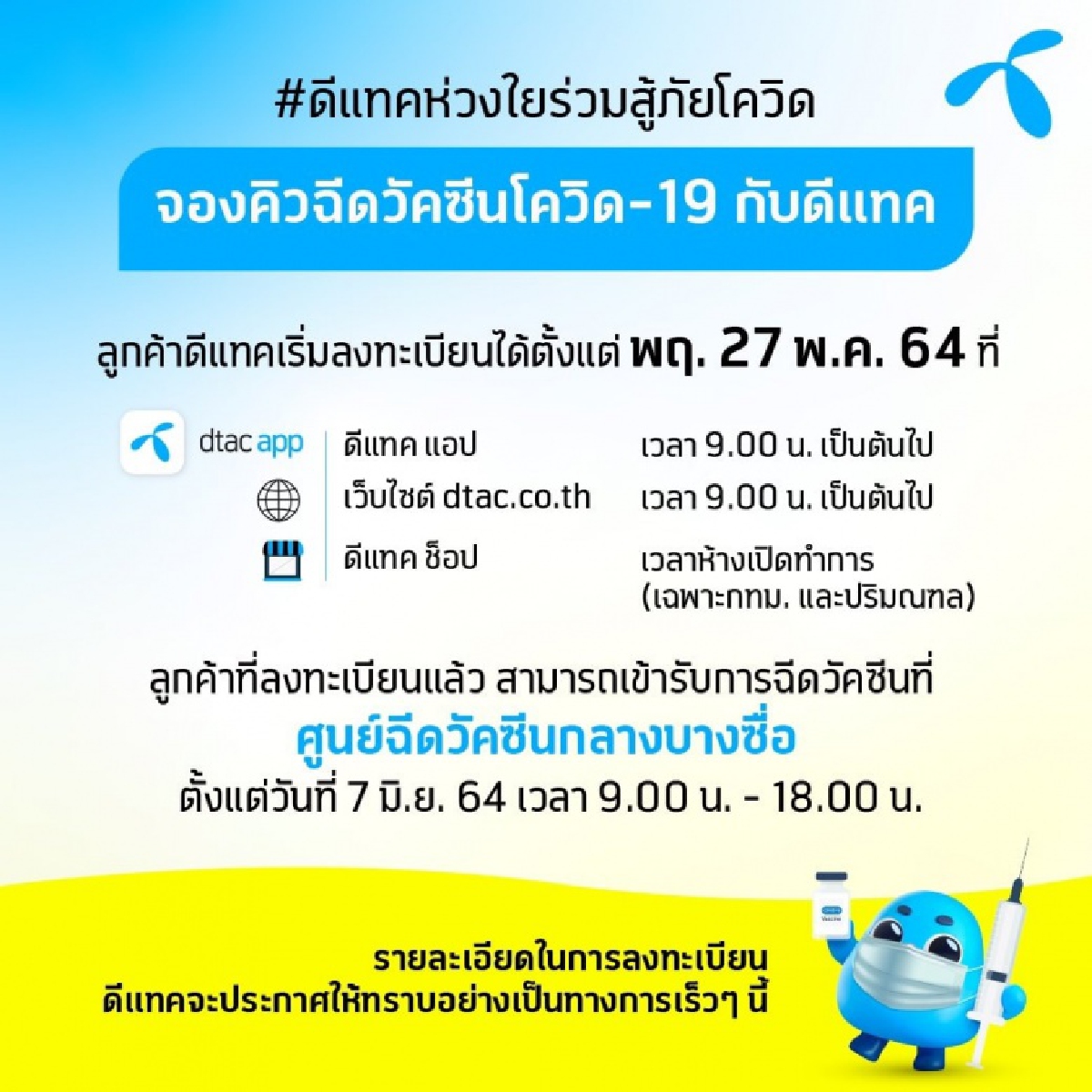 Ais On Twitter กระทรวงสาธารณส ข ร วมก บ กสทช เพ มช องทางให ประชาชนลงทะเบ ยนฉ ดว คซ นป องก นโคว ด 19 ผ านค ายม อถ อ ล กค าเอไอเอสลงทะเบ ยนจองฉ ดว คซ นป องก นไวร สโคว ด 19 ก บโครงการศ นย ฉ ด ว คซ นกลางบางซ อ ณ สถาน กลางบางซ อ ว นท 27 พ ค 64 เวลา